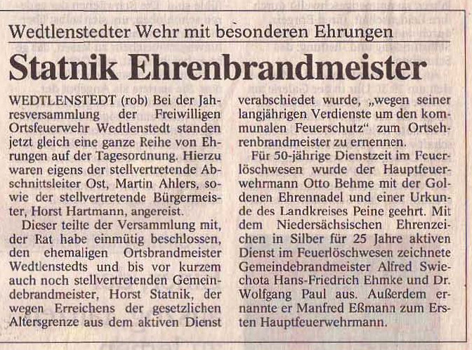 Jahreshauptversammlung 2001 - Wedtlenstedter Wehr mit besonderer Ehrung Zeitungsbericht, erschienen in der Braunschweiger Zeitung am 11. Januar 2001