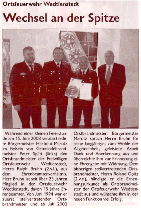 Ortsfeuerwehr Wedtlenstedt - Wechsel an der Spitze Die Amtsübergabe fand am 15. Juni 2009 statt.(Anmerk. FFW)