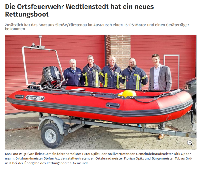 Die offizielle Übergabe des Bootes an die Ortsfeuerwehr fand dann einige Tage nach Eintreffen durch Bürgermeister Tobias Grünert und Gemeindebrandmeister Peter Splitt vor dem Feuerwehrhaus in Wedtlenstedt statt, heißt es weiter in der Pressemitteilung. Die Gemeindefeuerwehr Vechelde verfügt laut Verwaltung nun über zwei motorbetriebene Rettungsboote. Ein Boot befindet sich bei der Ortsfeuerwehr Wedtlenstedt, das andere Boot – nun ebenfalls ausgestattet mit einem neuen 15-PS-Motor und einem neuen Geräteträger – bei der Ortsfeuerwehr Sierße/Fürstenau.