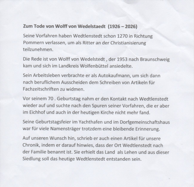 Zum Tode von Wolff von Wedelstaedt