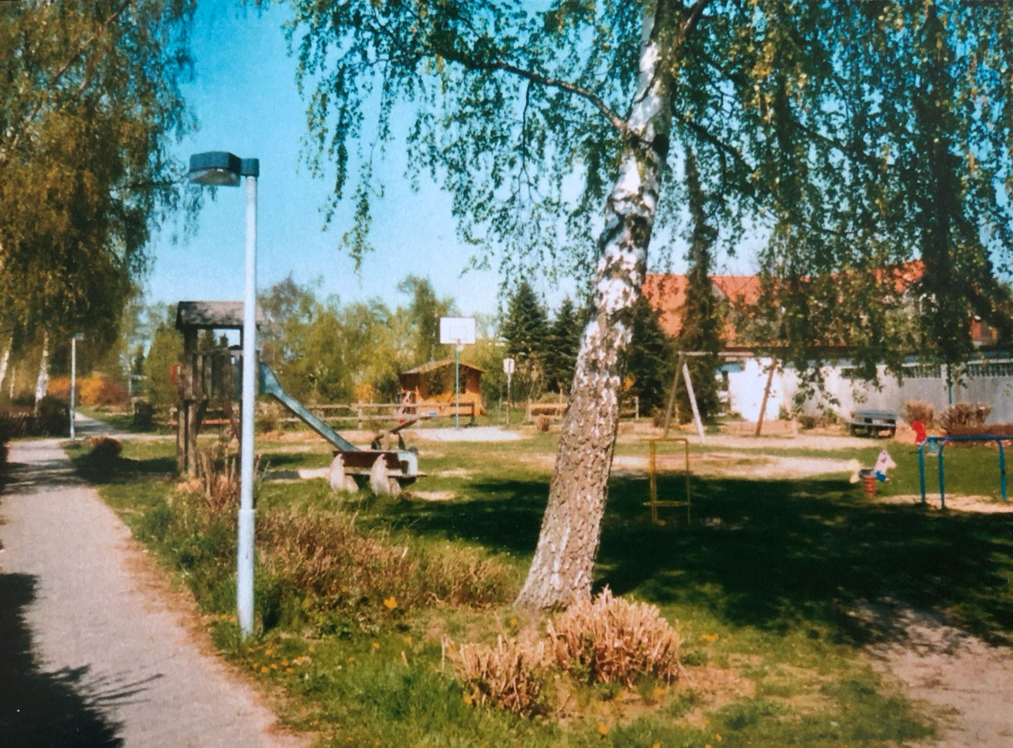 Das Bild zeigt den ehemaligen Spielplatz. Auf dieser Fläche steht jetzt die Turnhalle und das Schützenheim.