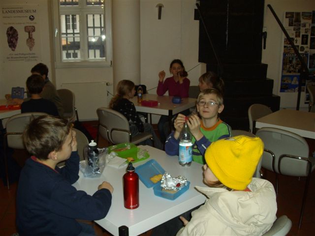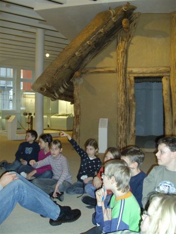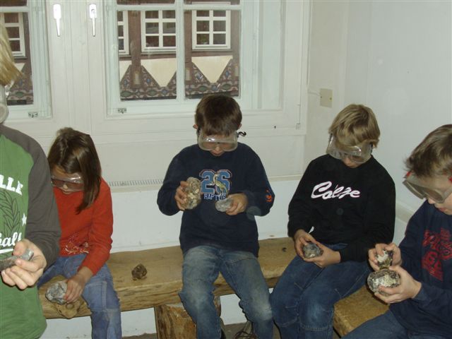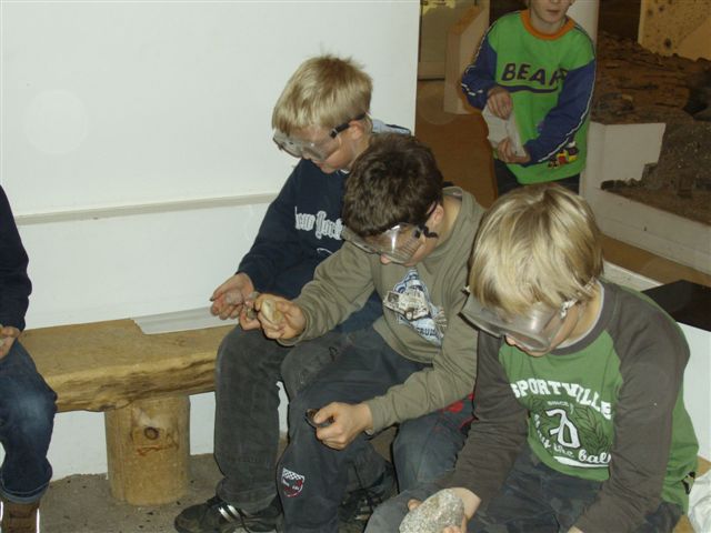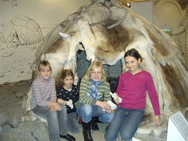 Wir Kinder der Steinzeit Ag haben die Abteilung für Vor- und Frühgeschichte des Landesmuseums in Wolfenbüttel besucht. Dort haben wir vieles ausprobieren können. So versuchten wir eine Pfeilspitze aus einem großen Feuerstein mit Hilfe eines Schlagsteins zu schlagen - es gelang uns scharfe Splitter abzuschlagen, allerdings brauchten einige hinterher ein Pflaster!!!