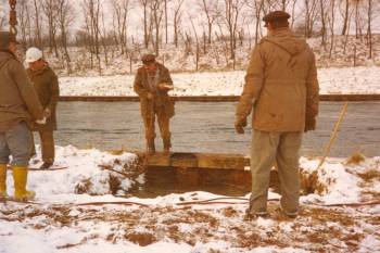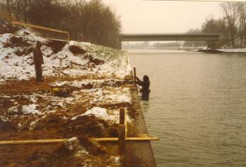 Die Arbeiten zur Hafeneinfahrt wurden Anfang 1983 vorgenommen. Das Einrammen einer 16 m langen Stahlwände war problemlos und dauerte jeweils nur 20 Minuten. Unter Wasser mussten von einem Taucher Lücken in die vorhandene Spundwand des Kanals geschnitten werden. „Ich nehme bald Honorar” rief der Taucher Roland Töpfer, als er zum wiederholten Male fotografiert wurde. Anschließend wurde das Erdreich weggebaggert. Als Abschluss wurde die Brücke eingehangen. Die Durchfahrt ist 5 m hoch, 7 m breit und hat eine Wassertiefe von 2,50m (wie auch das gesamte Hafenbecken). Im April war das Hafenbecken, der ursprüngliche Kiessee, an den Kanal angeschlossen. Restarbeiten wie die Anlage der Böschungen mussten noch gemacht werden.
